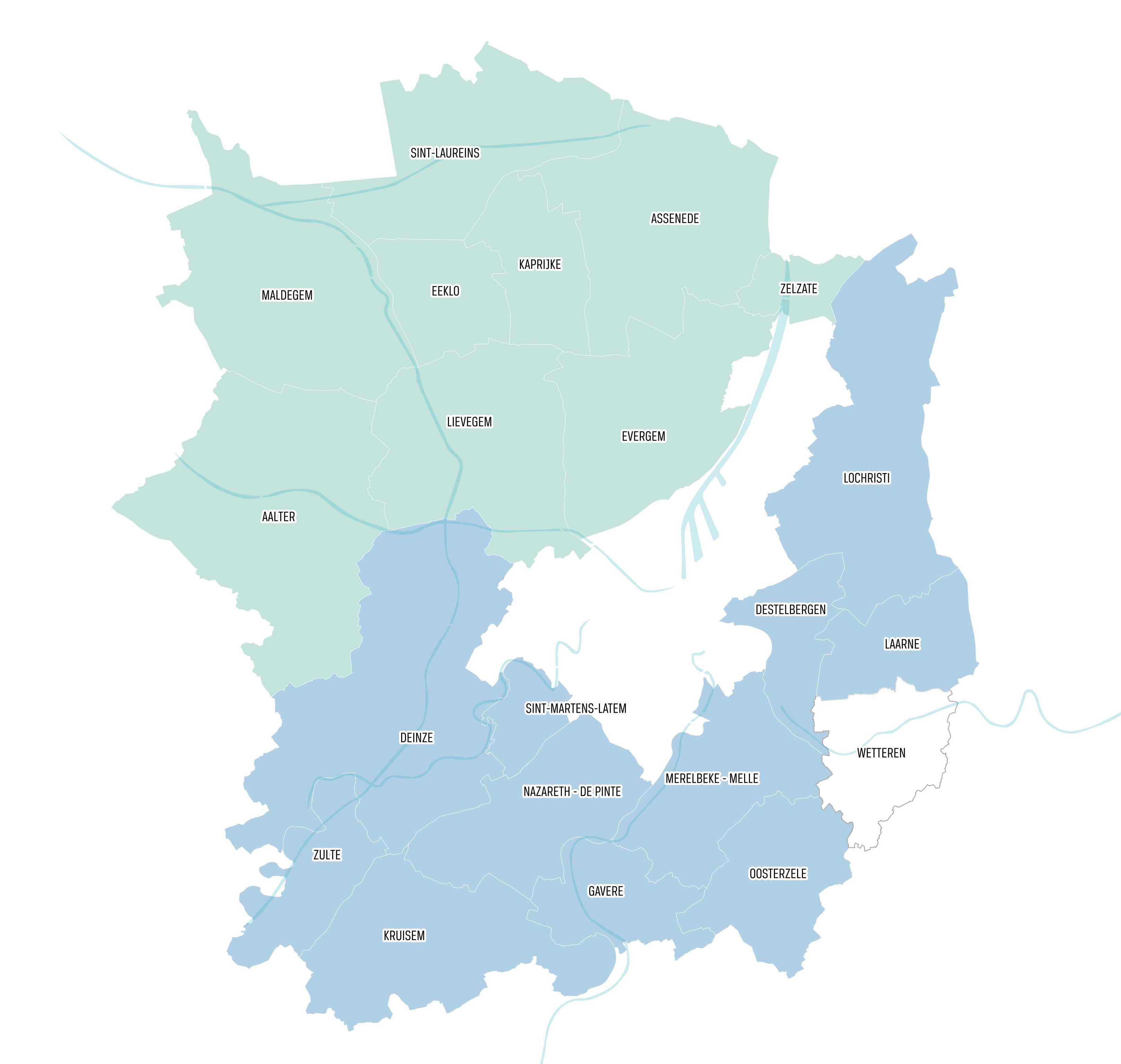 Aalter, Assenede, Deinze, Destelbergen, Eeklo, Evergem, Gavere, Kaprijke, Kruisem, Laarne, Lievegem, Lochristi, Maldegem, Merelbeke-Melle, Nazareth-De Pinte, Oosterzele, Sint-Laureins, Sint-Martens-Latem, Zelzate en Zulte.